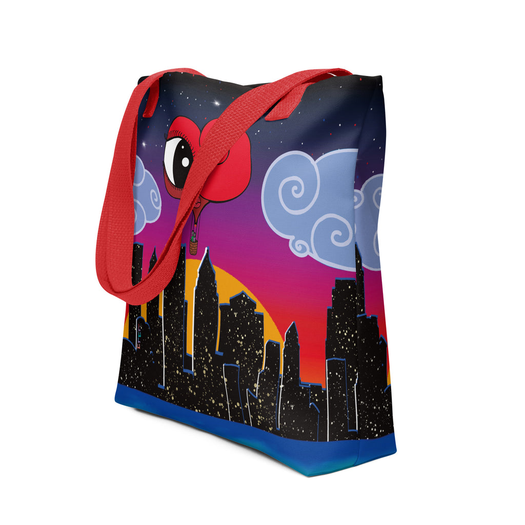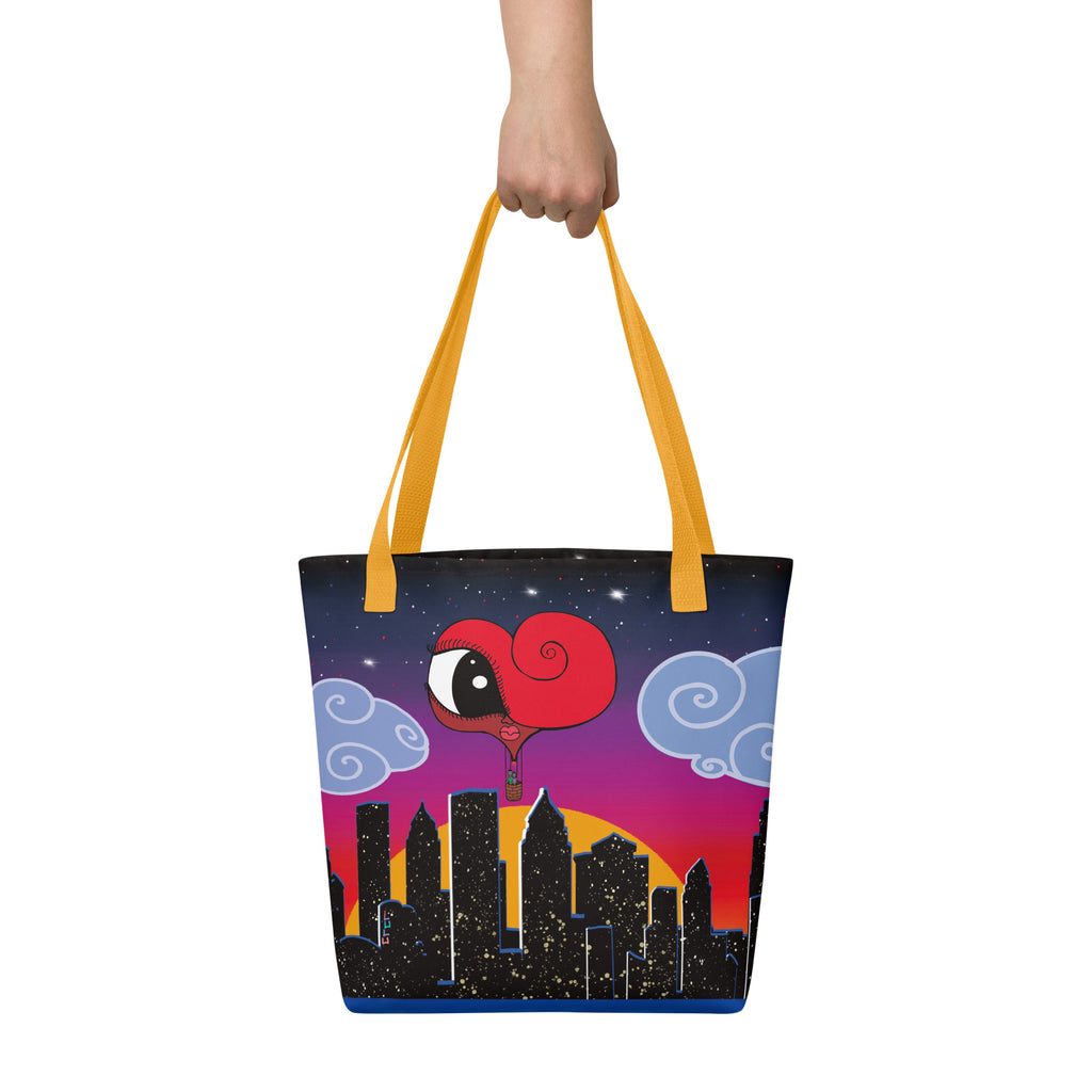 A spacious and trendy tote bag to help you carry around everything that matters. Specially designed by Artysta LuLu and a popular choice by art lovers world wide! Perfect for the classroom, your business meetup, book club, farmers market and more. Showcase your romantic side with this adorable scene of a couple enjoying the areal view of the city while the sunsets in the background. Customize your bag with your choice of cotton bull denim straps in black, red or dandelion yellow.